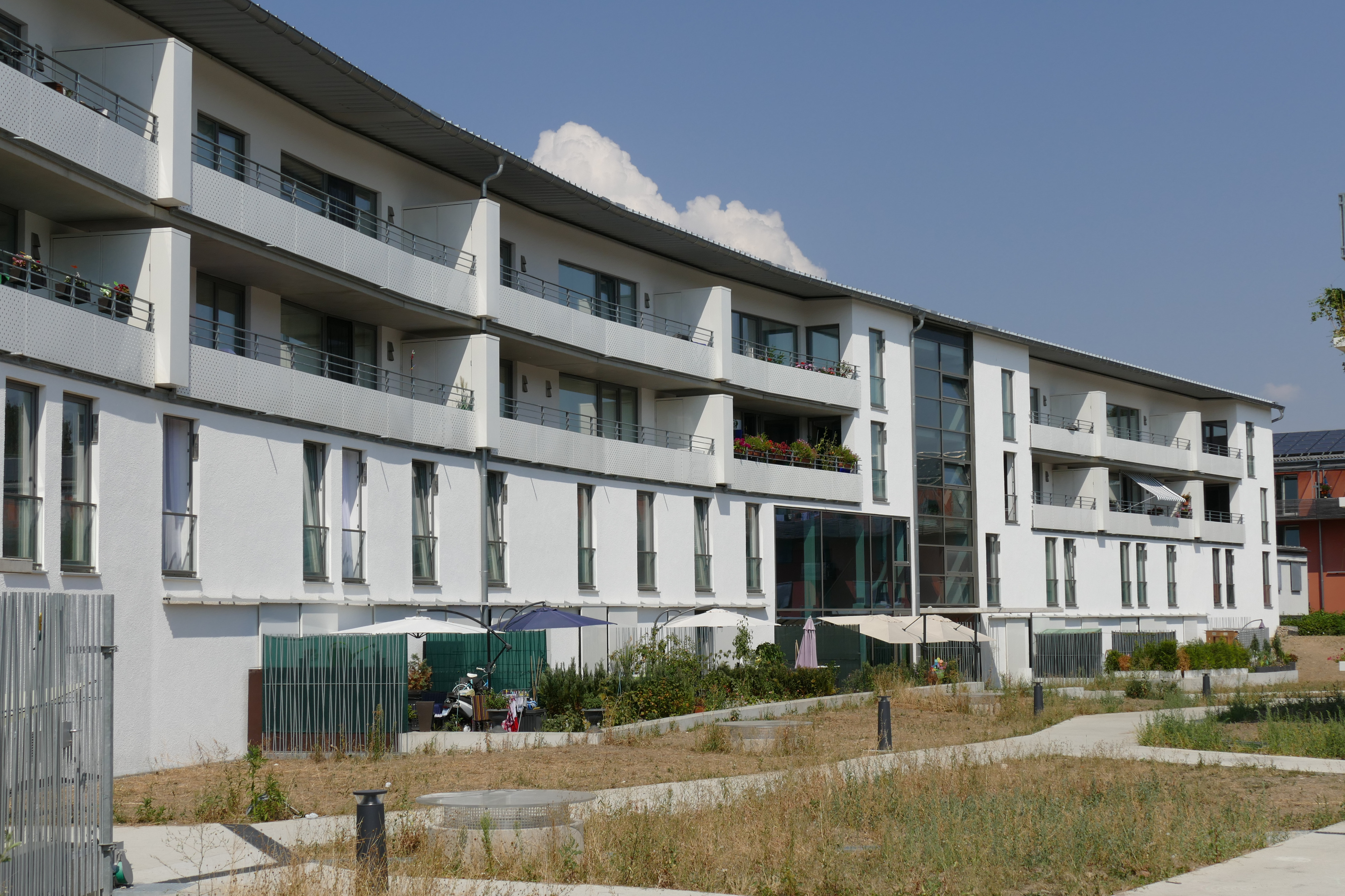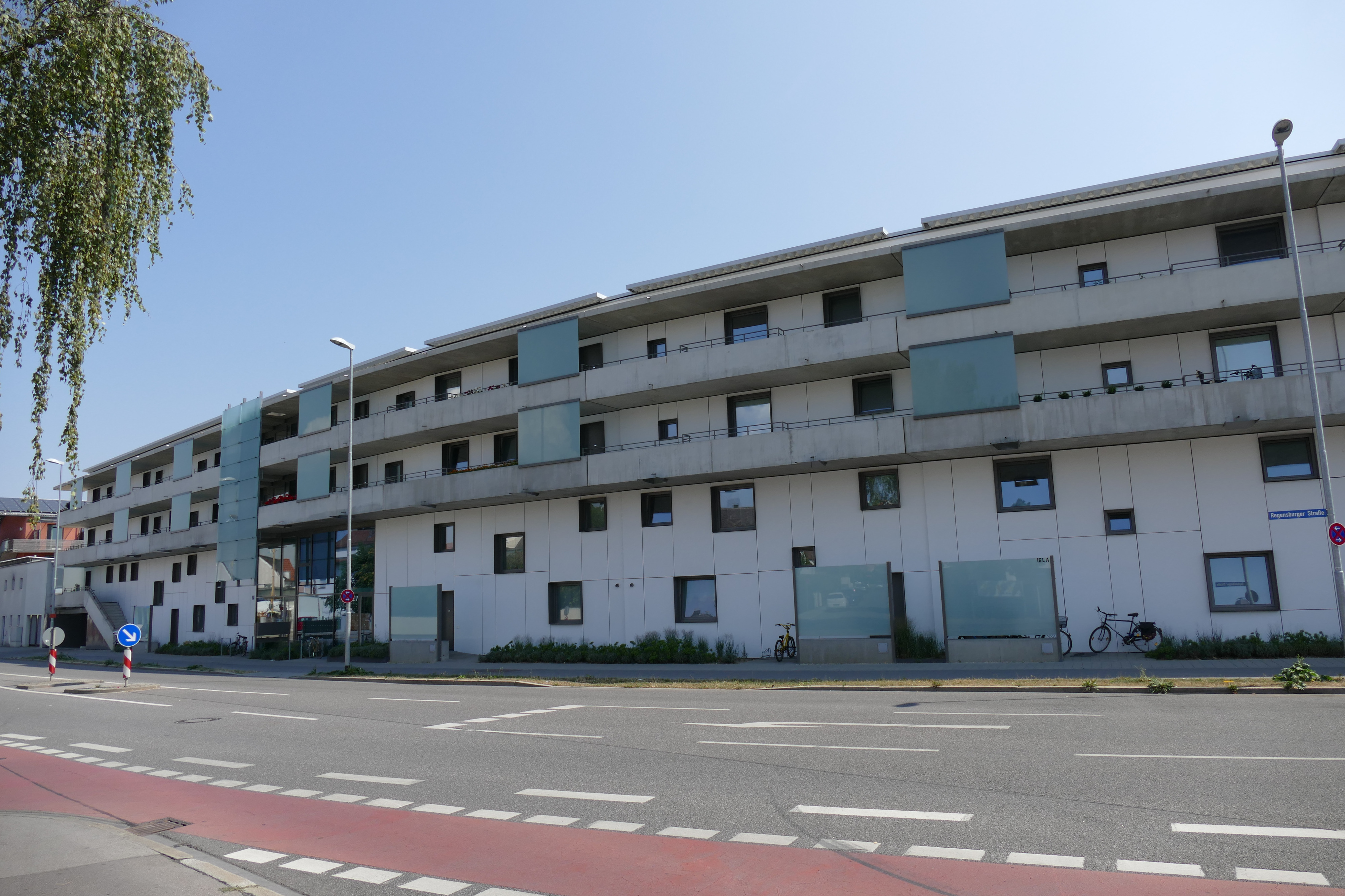 Die 5-geschoßige Wohnanlage mit Gewerbeflächen, Tiefgarage und Trapezwellblech-Flachdächern wurde komplett unterkellert auf Flächengründung mit Bodenplattenverstärkung ausgeführt. Die tragende Konstruktion des geschwungenen Gebäudes besteht aus massiven Deckenplatten, Wänden und Stützen aus Stahlbeton.