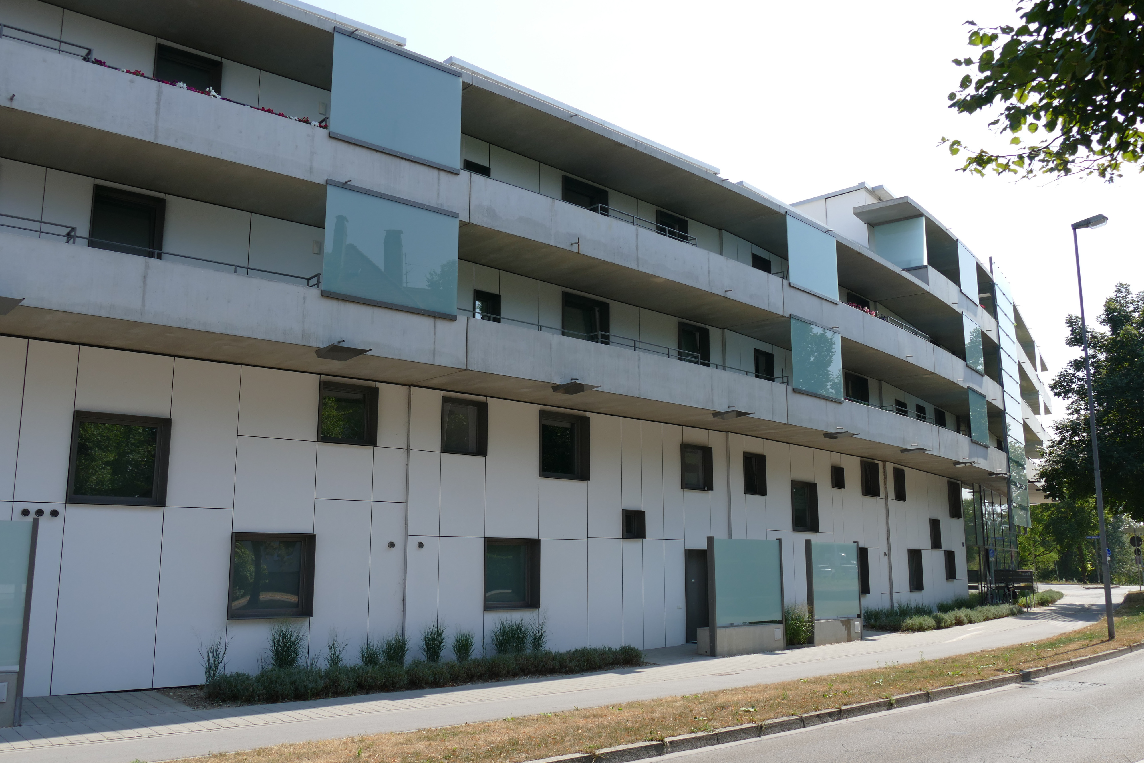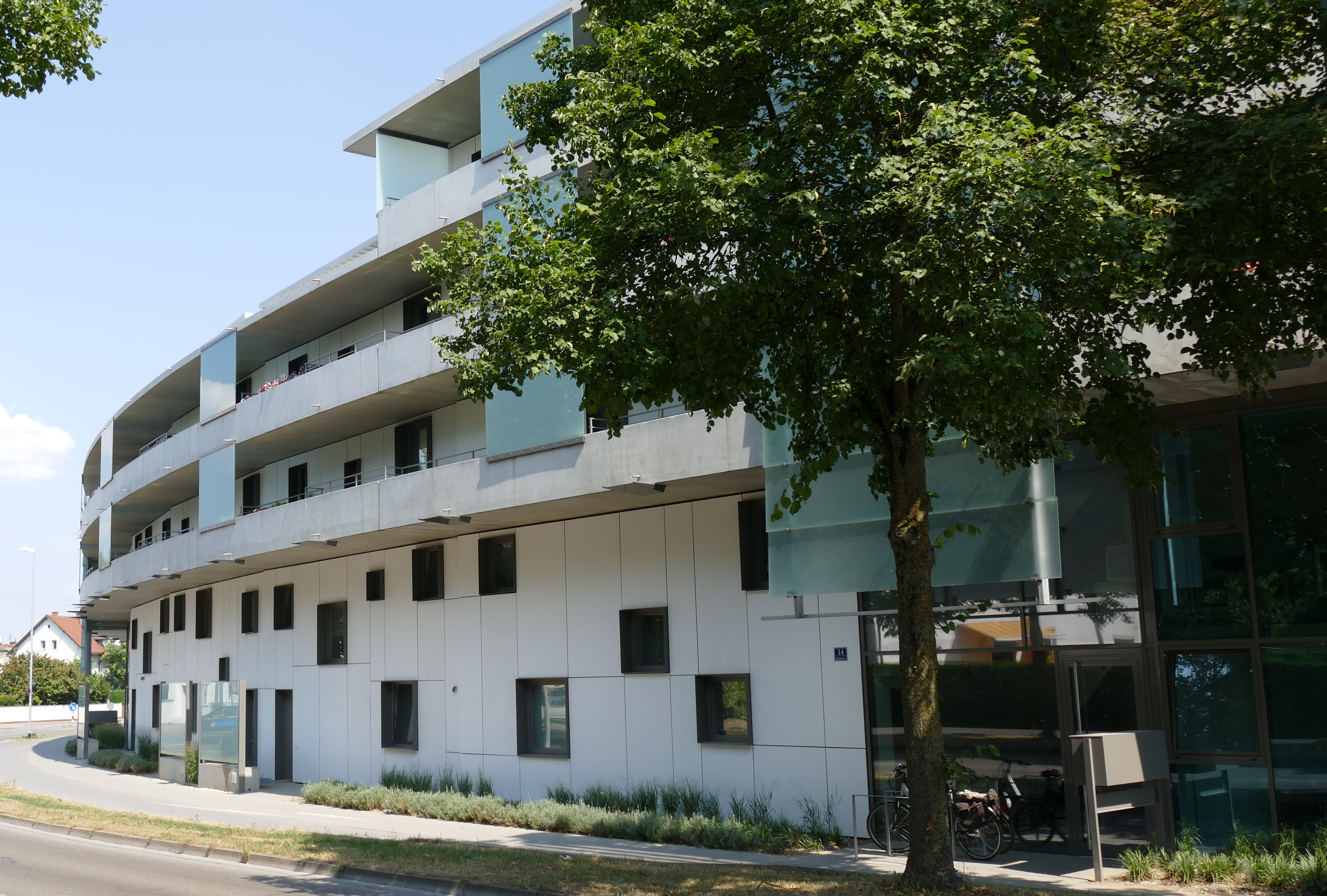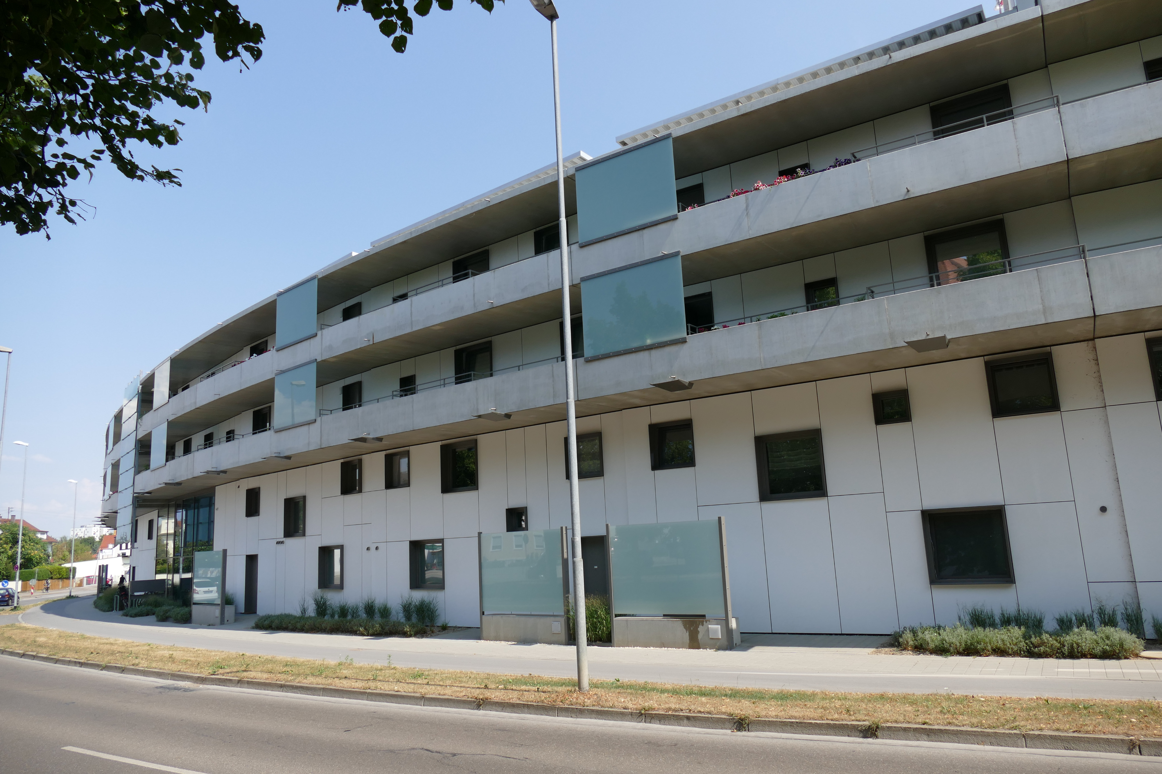 Besonderheiten: Mehrschalige Außenwandkonstruktion; geschwungenes Gebäude; schwere, gerundete Balkonfertigteile (12 to); freischwebende Auskragung von 5 m; versetzte Fassadenelemente ohne flüssigen Lastabtrag