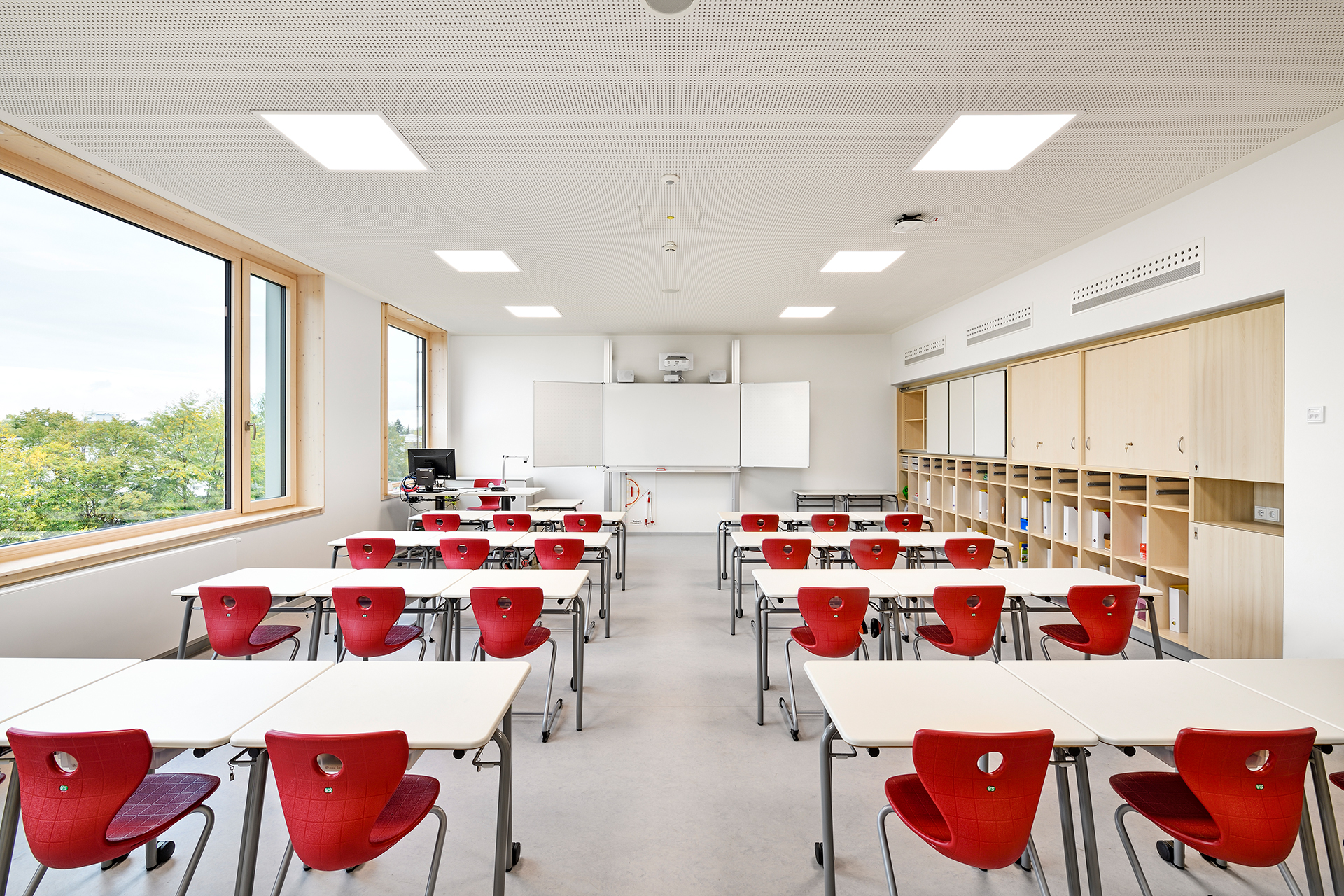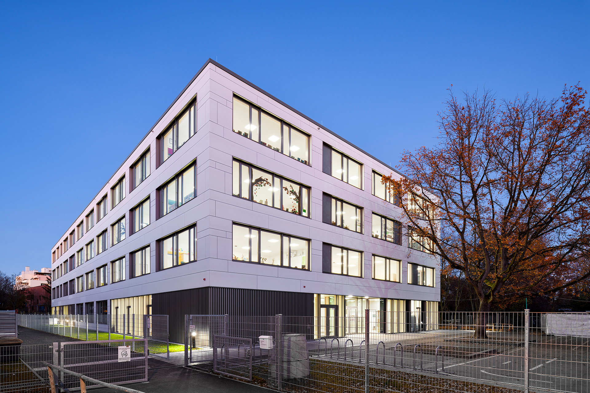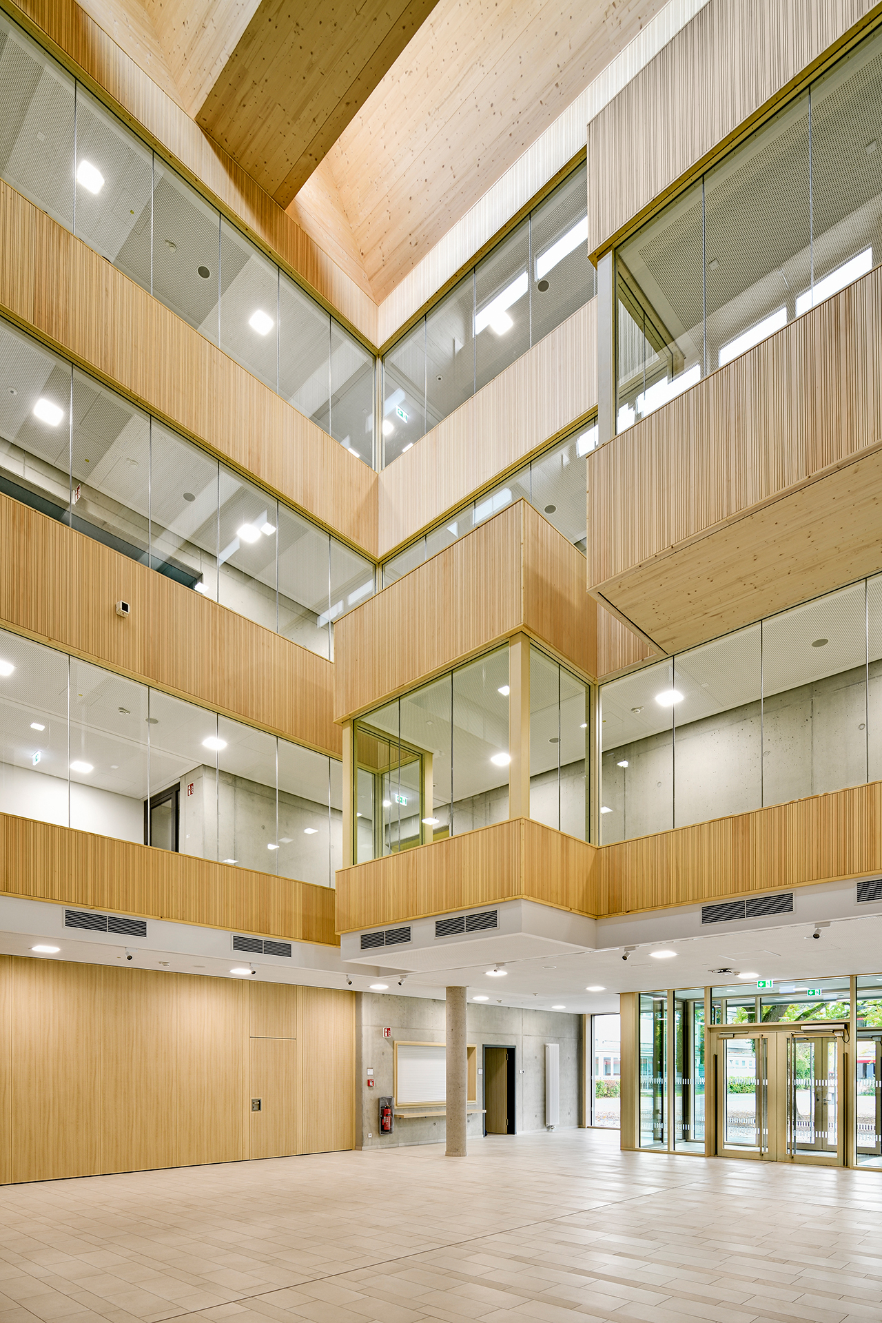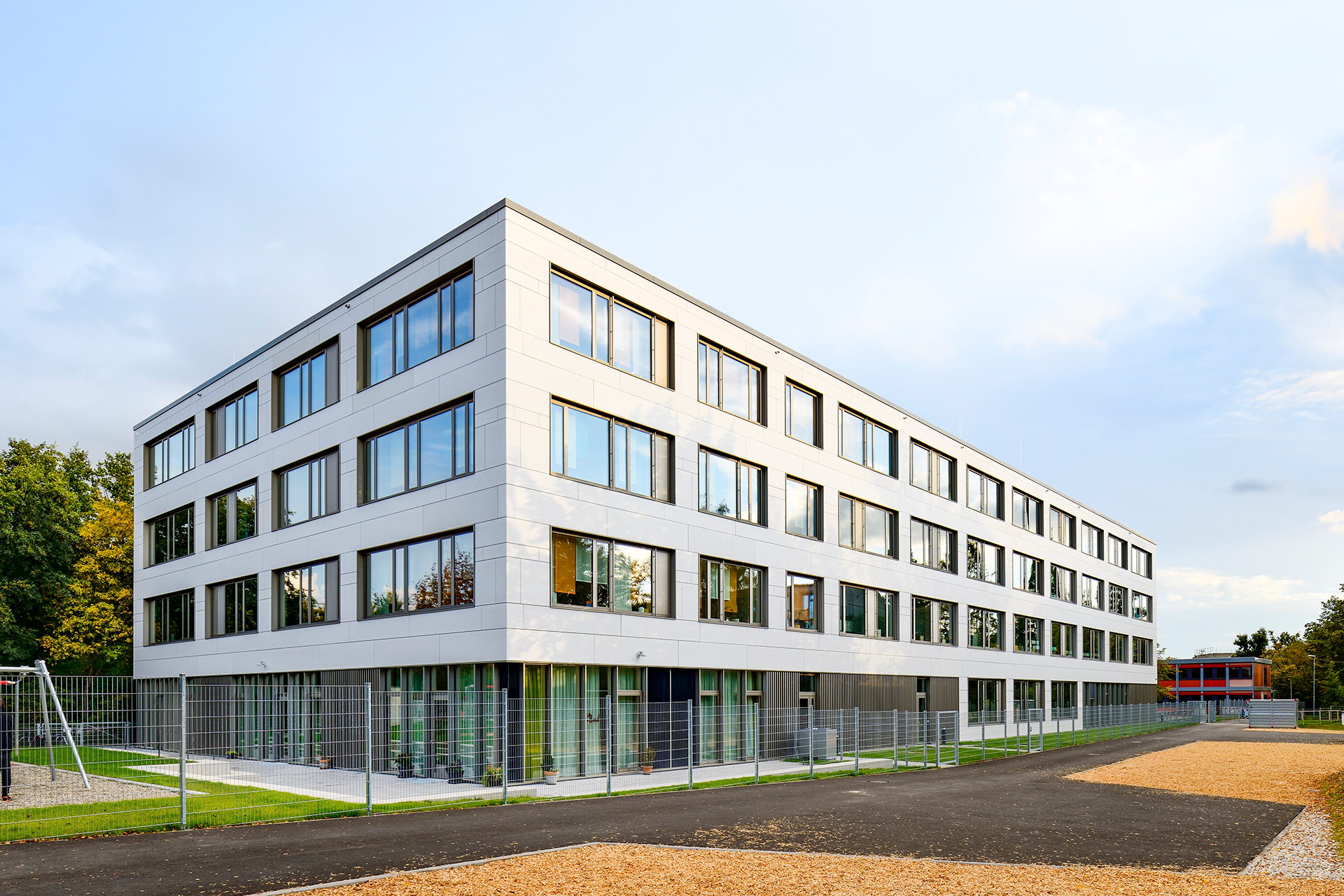 Insgesamt umfasst das Bauvorhaben am Thoner Espan in Nürnberg den Neubau einer Grundschule, Hort- und Mittagsbetreuungsplätzen sowie eine Dreifachsporthalle. Im Zuge des ersten Bauabschnittes (BA 1) ist neben dem 4-gruppigen Kinderhort eine Grundschule mit einer Pausenhalle errichtet worden.
